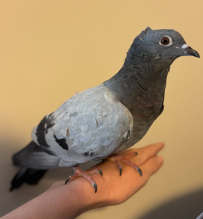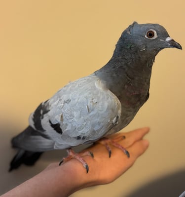 Asphalt is a scrappy young survivor with a flair for fashion, this feral pigeon sports a fabulous natural "fancy haircut" that sets them apart in any flock. Found as a fledgling after a predator attack in a sweltering parking lot, Asphalt was rescued and lovingly rehabilitated in the home of DCPR’s president. Though currently deep in the throes of "cooberty" (pigeon puberty), complete with a touch of teenage angst, Asphalt’s early exposure to people means they’re familiar with human companionship, even if it takes a little time for them to fully warm up to new folks.