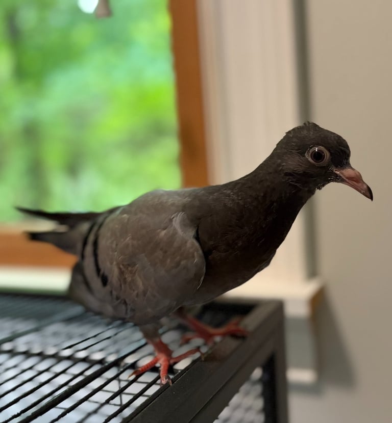 Meet Luffy, a resilient young feral pigeon with a big heart and an even bigger will to thrive. As a baby, Luffy survived a predator attack and was also found with an older ankle injury that had already healed a bit crooked. Despite these challenges, he’s grown into a strong and capable bird who gets around well, he just appreciates softer cage surfaces to keep him comfortable. His determination and gentle spirit make him a truly special companion.