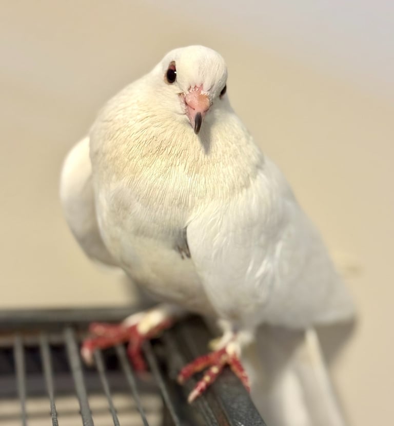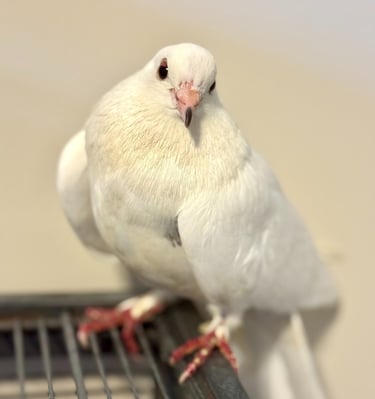 Panna Cotta is a delicate little mystery with a dessert-smooth vibe and a striking pair of "cracked" eyes that give them an unforgettable look. Likely a release bird from the mass-release situation we handled in late June through July, Panna Cotta is small in size, age unknown, and still figuring out what to make of their new life in safety. Though skittish, they're surprisingly calm- so much so that when a volunteer accidentally left their cage open overnight, Panna Cotta simply stayed put, unbothered.