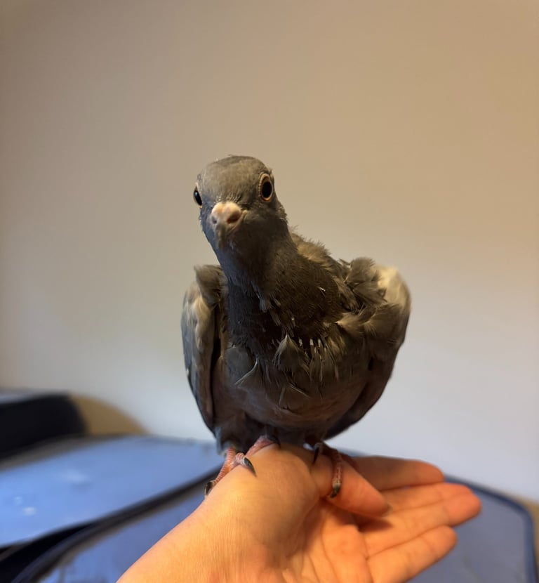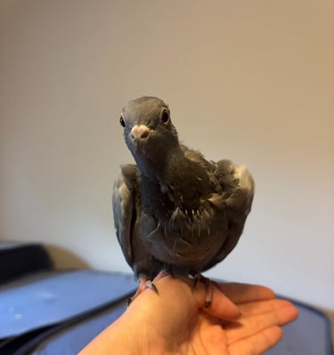 Tarmac is a sweet juvenile blue bar pigeon with a heart as soft as their feathers. Found alone in a scorching parking lot during a heat wave, this lucky sweetie was rescued by a kind vet tech and hand-raised with love by the president of DCPR. Thanks to all that early TLC, Tarmac is incredibly people-friendly and enjoys human company, but like any growing youngster, they may go through a brief feisty phase during "cooberty" (pigeon puberty) in the next couple of months. Their sex is still unknown, but their personality is already shining through: affectionate, curious, and ready for a forever home (they will need to be an indoor pet, as they have only ever know the "home" life).
