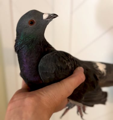 Torte is a feisty, high-energy bird who prefers to keep a bit of distance for now. Skittish when approached and quick to make their opinions known, Torte is still figuring out what it means to trust humans. But beneath that spirited exterior is a bright, intelligent pigeon who has the potential to bond deeply with someone patient, gentle, and willing to let Torte set the pace. With consistent kindness and calm handling, this fiery little fluff-foot could transform into a devoted companion.