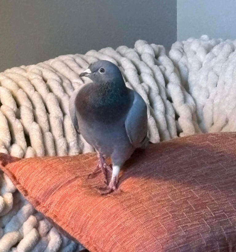 Meet Fettuccine, an assumed-male (not DNA-confirmed) racing Homer with a big personality, a bigger heart, and a rescue story that captured an entire neighborhood. We believe Fettuccine was part of the mass-release situation that swept through the area in July, but unlike many pigeons who vanished into the city, he stuck close, mostly because he needed help. After what was likely a predator attack left him with a broken leg, Fettuccine was seen courageously hopping around on one foot, visiting porches and doorsteps in search of support. Neighbors fed him everything from crackers to Oreos, cheering him on as he tried his best to survive.